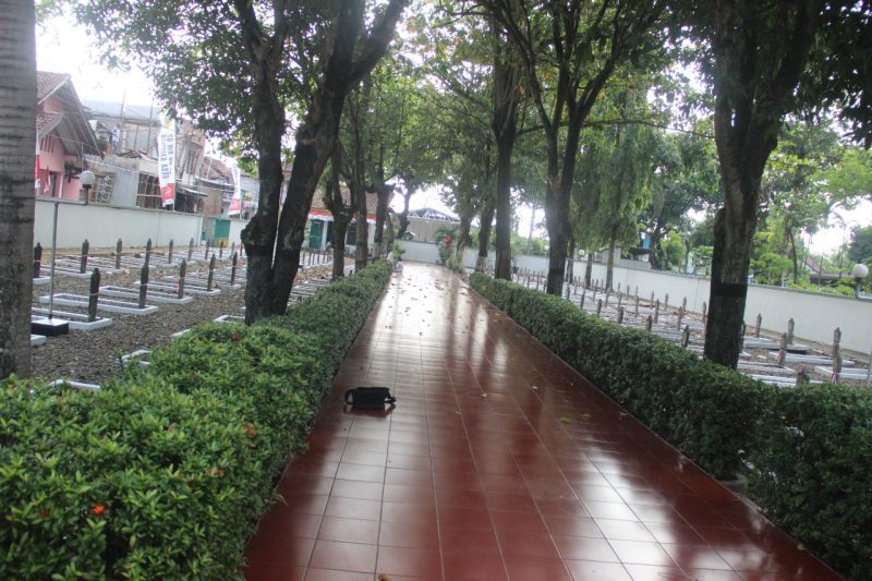 Kemudian di belakang tugu tersebut terlihat 163 makam yang berbentuk seragam. Terbagi menjadi dua- di sisi utara dan selatan. Sedang di bagian tengah berlantak keramik warna merah dan di kiri kanannya terlihat beberapa pohon besar berdaun lebat. Serta di sekelilingnya “dipagari” tanaman berbunga setengah meter.